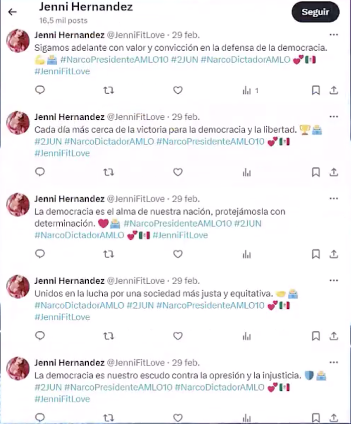 “Analizando hasta los tuits con error con un ‘botnet’ se habla de unas 50 o 100 cuentas que tienen fotografías de modelos eróticas –que incluso podrían denunciarse por usurpación de identidad– y todas tienen exactamente la misma actividad de otras 300 o 400 cuentas de bots sin contenido erótico […] hay ciertos hashtags o palabras que usaban todas al mismo tiempo y hacen hashtags favorables a Xóchitl o usan las narcoetiquetas o difunden las encuestas falsas de Massive Caller. Todas manejan el mismo contenido”, sostuvo el analista.