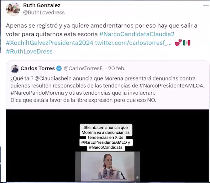 Como documentaron Julián Macías y Alberto Escorcia, expertos en el análisis de redes sociales y desinformación, con el paso de los días, las cuentas encargadas de impulsar la campaña de #NarcoPresidente empezó a empatarse con la campaña de apoyo a Xóchitl Gálvez, la candidata del PRI, PAN y PRD.