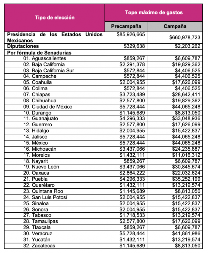 En este proceso electoral, además de la elección presidencial, se disputarán las 500 diputaciones y 128 senadurías del Congreso de la Unión. El Instituto Nacional Electoral ha establecido topes de gastos de campaña para los candidatos fijando un límite de 2 millones 203 mil 262 pesos para los candidatos a diputados federales. Para los candidatos a senadores se han definido diferentes topes de gastos de campaña, variando según las áreas geográficas o contiendas federativas.