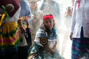Al terminar las danzas ancestrales, representantes de cada pueblo subieron al basamento principal del otrora edificio prehispánico de Cuicuilco para dejar las ofrendas, ataviados con pulseras, collares, rebozos y huipiles (vestidos), acompañados de sonidos de tambor, sonajas y cánticos.
