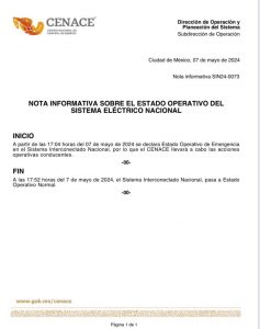 Un boletín del Cenace señala que a las 17:04 horas de este martes, fue declarado el Estado Operativo de Emergencia, por lo que dicha dependencia llevaría a cabo "las acciones operativas contundentes" para atender la situación.