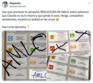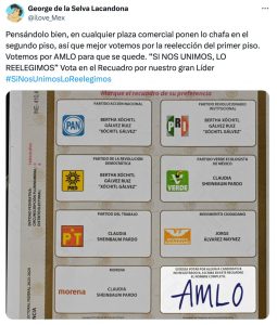 A esta “campaña” se sumó el analista político José Antonio Crespo, quien escribió: “A los millones de adoradores de AMLO les recomiendo votar de nuevo por él en lugar de por Claudia. En la boleta hay un espacio especial para hacerlo”. Compartió una imagen de la boleta electoral marcada con las siglas de AMLO.