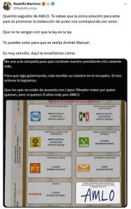 El mensaje fue compartido por el Senador Emilio Álvarez Icaza, quien escribió: “Atención: siempre hay un espacio en blanco en las boletas electorales y la ciudadanía pone el nombre que le antoje. Y como bien dice Jorge Lara, si alguien quiere poner el nombre o las siglas de López Obrador, lo puede hacer.”