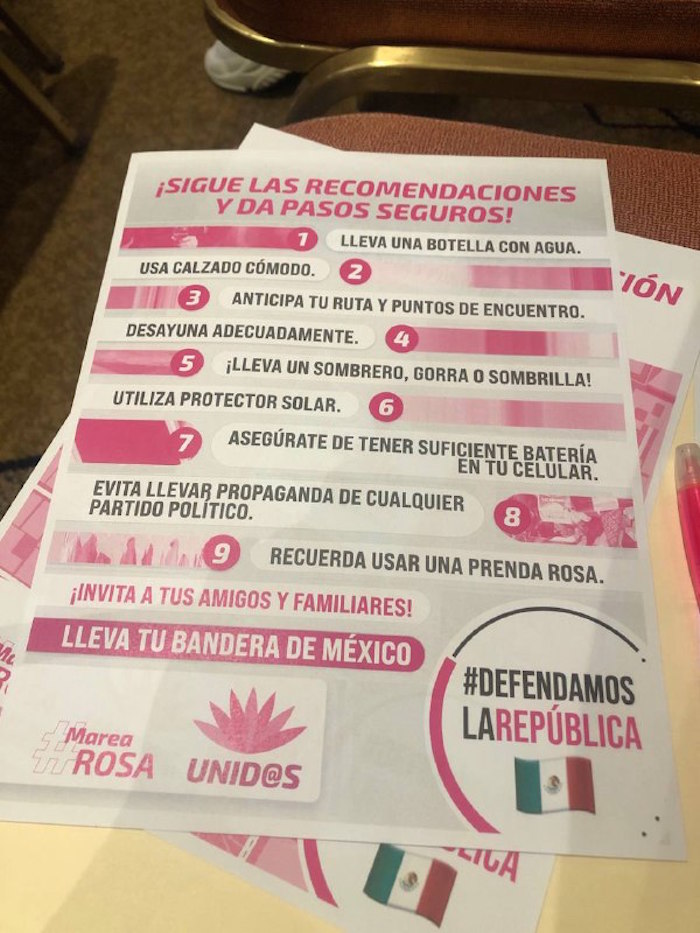 Pese al reconocimiento de que la Marea Rosa no es neutral y aún cuando sus oradores principales serán los abanderados del PRI-PAN-PRD a la Presidencia y la Ciudad de México, entre las recomendaciones que hoy hizo el movimiento a quienes asistirán al acto está el no llevar propaganda de ningún partido.