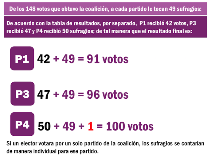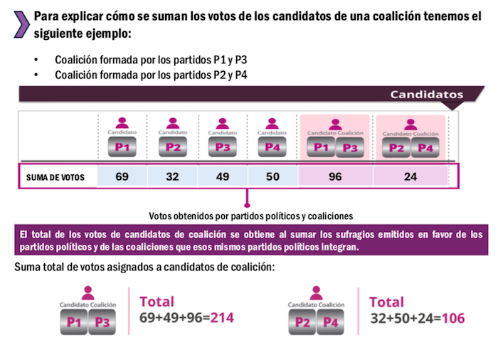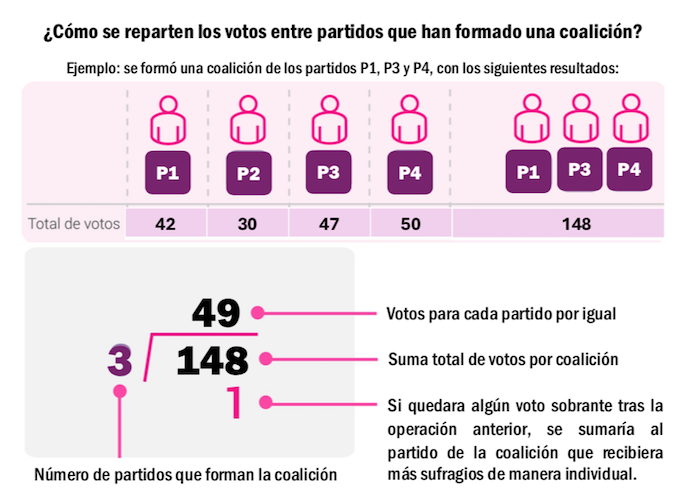 Sin embargo, todas las boletas en las que sean cruzados los tres emblemas de los partidos que integran las dos coaliciones, Sigamos Haciendo Historia y Fuerza y Corazón por México, los votos correspondientes se repartirán, de marera equitativa, entre los tres partidos coaligados.