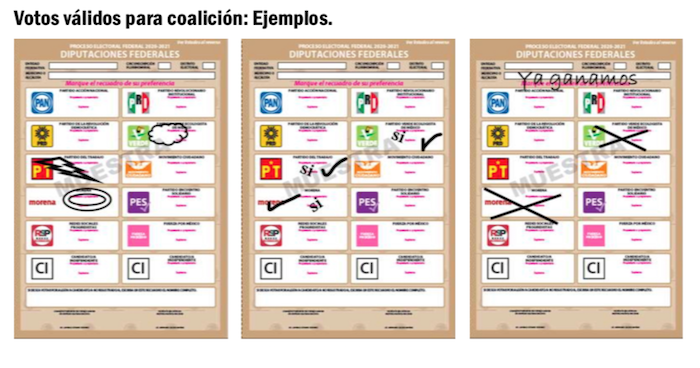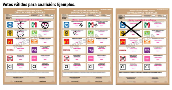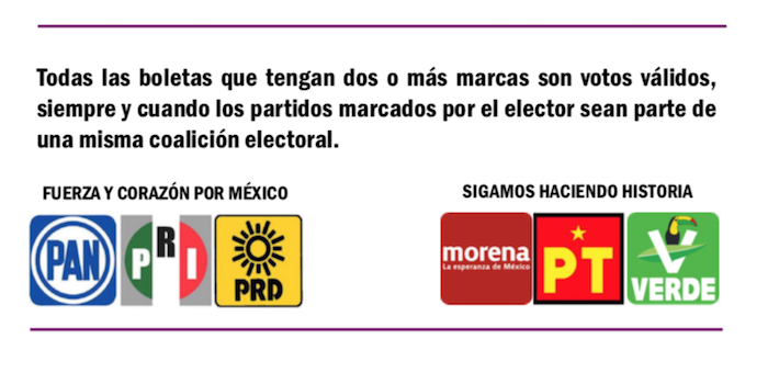 No importa si los ciudadanos cruzan en una misma boleta los logotipos de Morena-PT y PVEM, o en su caso, los de PAN, PRI, PRD, pues en cualquiera de los dos supuestos, la boleta depositada en las urnas valdrá únicamente por un voto.