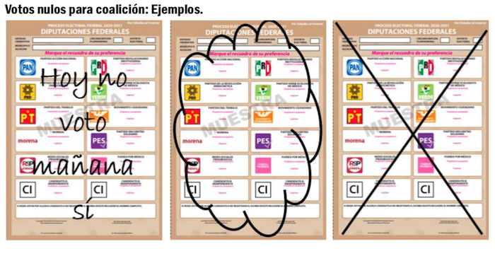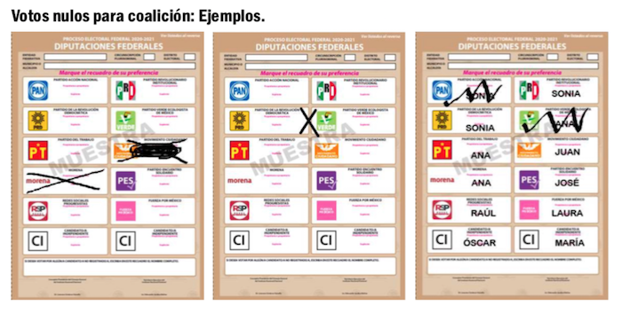 Es un voto nulo: a).- Aquél expresado por un elector en una boleta que depositó en la urna, sin haber marcado ningún cuadro que contenga el emblema de un partido político o de una candidatura independiente, y b).- Cuando el elector marque dos o más cuadros sin existir coalición entre los partidos cuyos emblemas hayan sido marcados. Y explica el mismo artículo que cuando el elector marque en la boleta dos o más cuadros y exista coalición entre los partidos cuyos emblemas hayan sido seleccionados, el voto contará para el candidato de la coalición y se registrará por separado en el espacio correspondiente del acta de escrutinio y cómputo de casilla.