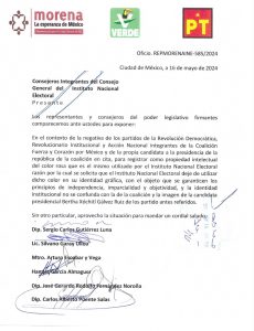 “En el contexto de la negativa de los partidos de la Revolución Democrática, Revolucionario Institucional y Acción Nacional integrantes de la coalición Fuerza y Corazón por México, y de la propia candidata a la Presidencia de la República de la coalición en cita, para registrar como propiedad intelectual del color rosa que es el mismo utilizado por el Instituto Nacional Electoral razón por la cual se solicita que el Instituto Nacional Electoral deje de utilizar dicho color en su identidad gráfica, con el objeto de que se garanticen los principios de independencia, imparcialidad y objetividad, y la identidad institucional no se confunda con la de la coalición y la imagen de la candidata presidencial Bertha Xóchitl Gálvez Ruiz de los partidos antes referidos”, se lee en el documento.