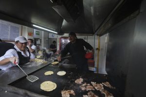 La otra mitad está abarrotada de clientes que, de pie, agarran sus platos de plástico y se sirven salsa con cucharones. Una ayudante extiende constantemente la masa de tortilla sobre una plancha.