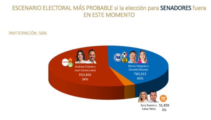 Por otra parte, De las Heras estableció que en el escenario más probable de la elección de senadores, si participara el 56 por ciento del electorado en Chihuahua, Andrea Chávez y Juan Carlos Loera de "Juntos Hacemos Historia" ganarían los curules en el Senado con un 54 por ciento de los votos, mientras que Mario Vázquez y Daniela Álvarez de "Fuerza y Corzarón por México" acumularían el 43 por ciento de los sufragios.