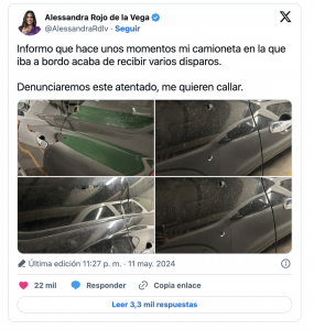“Informo que hace unos momentos mi camioneta, en la que iba a bordo, acaba de recibir varios disparos. Denunciaremos este atentado, me quieren callar”, escribió.