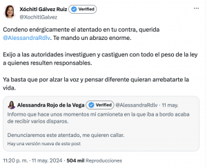 Xóchitl Gálvez, candidata presidencial de la alianza, condenó enérgicamente la situación, y exigió a las autoridades que investiguen y castiguen a quienes resulten responsables.