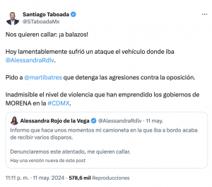 De la misma manera, Santiago Taboada, aspirante a la Jefatura de Gobierno, pidió a Martí Batres Guadarrama que detenga las agresiones contra la oposición, y señaló que era inadmisible el nivel de violencia en la capital.