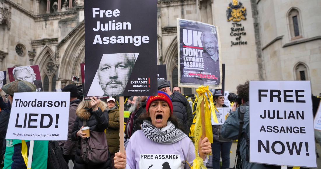 Una manifestante sostiene una pancarta frente a los Tribunales Reales de Justicia en Londres, el 21 de febrero de 2024, en apoyo al fundador de WikiLeaks, Julian Assange. Foto: Kin Cheung, archivo, AP