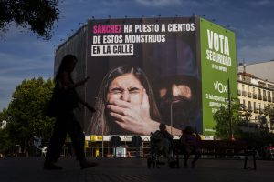 Una mujer pasa junto a un cartel electoral del partido de ultraderecha Vox en un edificio en Madrid, España, el miércoles 12 de julio de 2023. Foto: Manu Fernández, AP.