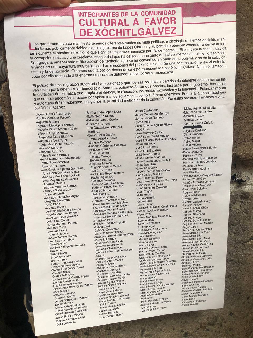 Ayer, más de 250 personas, quienes se definieron como integrantes de la comunidad cultural y entre quienes se encuentran los intelectuales opositores, Enrique Krauze, Héctor Aguilar Camín y Jorge Castañeda, difundieron un manifiesto en el llamaron a votar abiertamente por Xóchitl Gálvez, candidata presidencial del PAN-PRI-PRD.