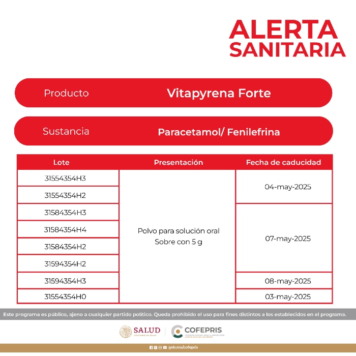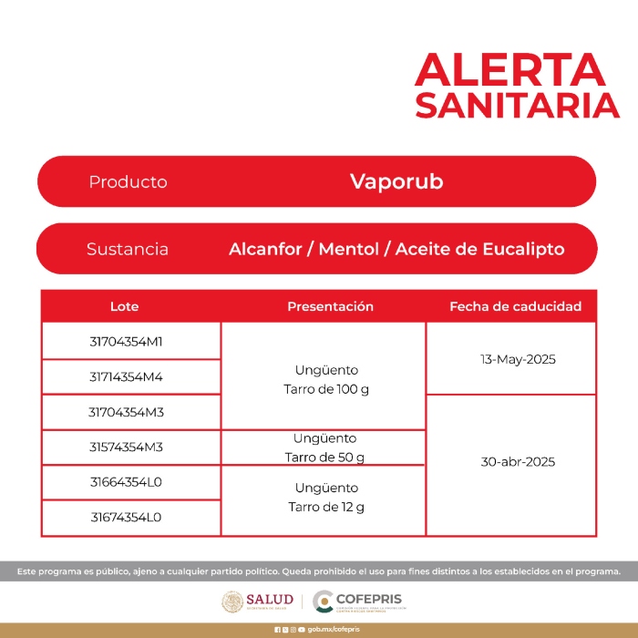 Por lo anterior, la Cofepris solicita a la población no adquirir ni utilizar Vaporub y VitaPyrena Forte con los números de lote enlistados en las siguientes imágenes, pues estos productos no están autorizados para su venta en México. En caso de identificar su comercialización, la Comisión pidió hacer la denuncia sanitaria correspondiente.