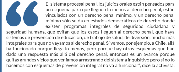 “Las experiencias que vemos es que mucho de lo que se cambia es lo visible, nuevos edificios, salas de juicios orales, tecnología para grabar juicios, muy bien, pero el juicio oral es la última etapa, la primera es la investigación el motor y ahí se requiere policías que investiguen y servicios periciales que generen pruebas científicas, fotografías, exámenes de ADN, y el riesgo es que tengamos sistemas que se queden con las apariencias”.