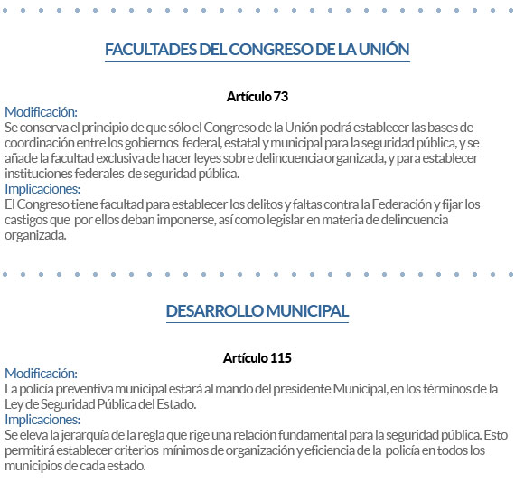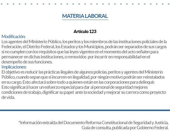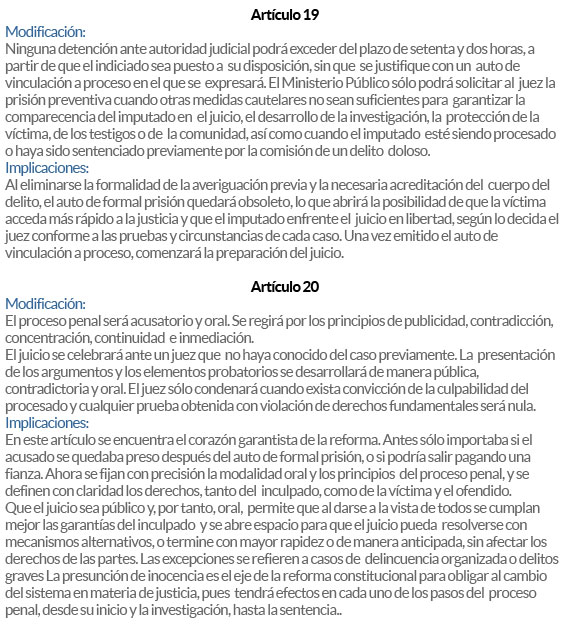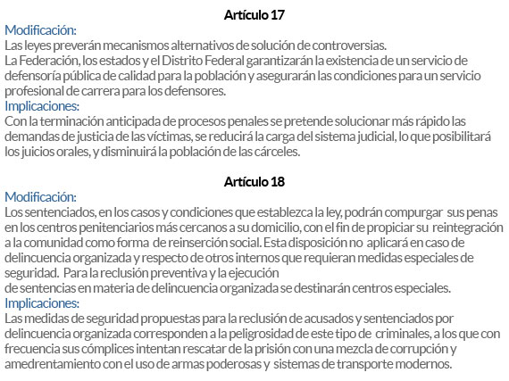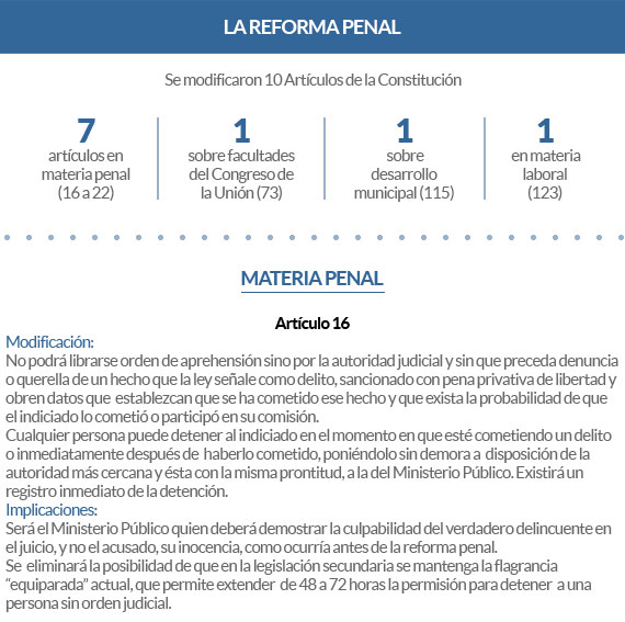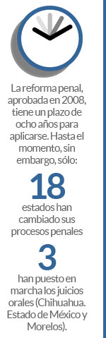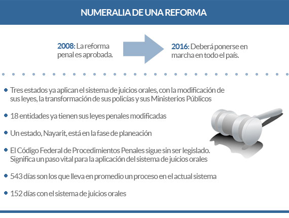 La reforma, aprobada en 2008 y que modificó 10 artículos constitucionales, tiene un plazo de ocho años para aplicarse (vencerá en junio de 2016). Ya está en marcha en los ámbitos de modificación de ley estatal, transformación de policías y Ministerios Públicos, así como los juicios orales en tres estados: Chihuahua, Estado de México y Morelos.