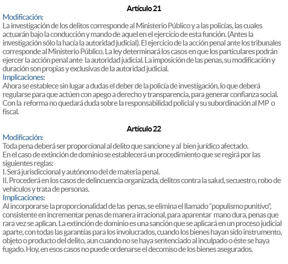 Uno de los aspectos más relevantes de la reforma del 2008 es que la nueva regulación del artículo 25 de la Constitución deja en el Ministerio Público las investigaciones del delito, y la policía puede auxiliarlo, aunque no podrá hacer de manera autónoma la investigación del delito.
