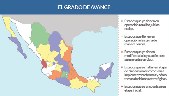 En los demás se encuentra en diferentes fases, desde entidades donde conviven el viejo con el nuevo sistema, como Nuevo León, o de otras que apenas han reformado su ley, o algunas que apenas están en la etapa de planeación inicial, como es Nayarit.