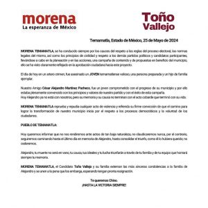 “El día de hoy en un artero crimen, fue asesinado un joven temamatiense valioso, una persona preparada y un hijo de familia ejemplar”, dijo.“Hoy Alejandro ya no está con nosotros, pero su memoria y su causa no terminan con el acto cobarde que terminó con su vida”, se lee en el boletín.
