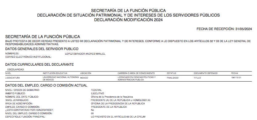 De acuerdo con su declaración, la cual entregó a la Secretaría de la Función Pública (SFP) en el último día del plazo legal para hacerlo, un millón 808 mil 826 pesos corresponde a su salario como titular del Ejecutivo federal y 28 mil 800 pesos provienen de la Pensión para el Bienestar de los Adultos Mayores.