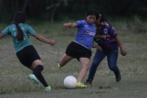 Esa tarde se pone el uniforme de fútbol y se dirige al campo, optimista, porque dice que cada vez más chicas se apuntan a jugar. En el camino de terracería, se cruza con mujeres mayores con sus tradicionales huipiles bordados y sus faldas de satén brillante y plisado que vuelven del campo, con el cuerpo encorvado por los enormes haces de hierba que llevan a la espalda.