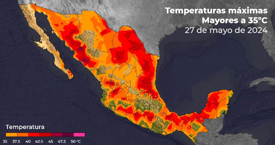 En tanto que, la Coordinación General del Servicio Meteorológico Nacional (SMN) pronosticó temperaturas mayores a los 45 grados centígrados en zonas de Baja California Sur, Campeche, Coahuila, Chiapas, Guerrero, Hidalgo (norte), Jalisco, Michoacán, Morelos, Nayarit, Nuevo León, Oaxaca, San Luis Potosí, Sinaloa, Sonora, Tabasco, Tamaulipas, Veracruz y Yucatán.