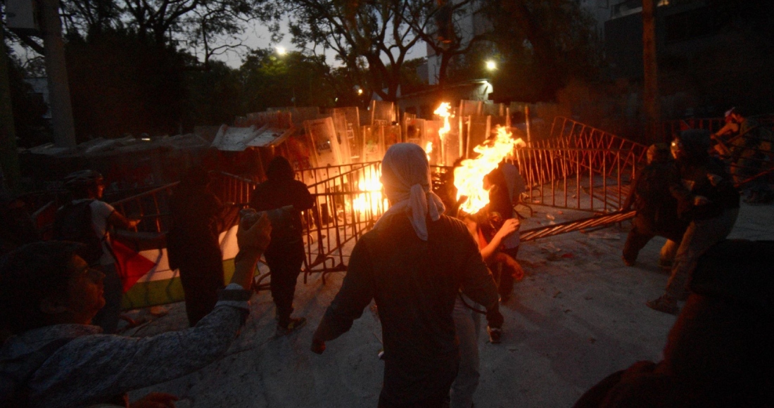 Manifestantes y policía capitalina se enfrentaron en la Embajada de Israel en protesta por los recientes bombardeos al campo de refugiados en Rafah. Las y los manifestantes fueron replegados con uso de extintores por parte de las autoridades. Exigen el cese al fuego y la ocupación militar contra el pueblo palestino. Foto: Haarón Álvarez, Cuartoscuro