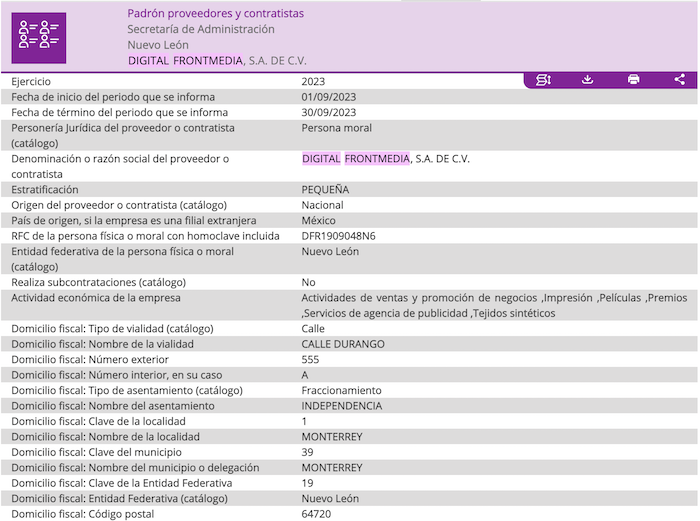 También aparece en 17 registros del Padrón de proveedores y contratistas de la Secretaría de Administración de Nuevo León por convenios entre agosto de 2022 y diciembre de 2023. No hay detalles sobre cuáles fueron sus actividades, pero en la información publicada por el Gobierno de la entidad la empresa es descrita por especializarse en comercio, “ventas y promoción de negocios, impresión, películas, premios, servicios de agencia de publicidad y tejidos sintéticos”.