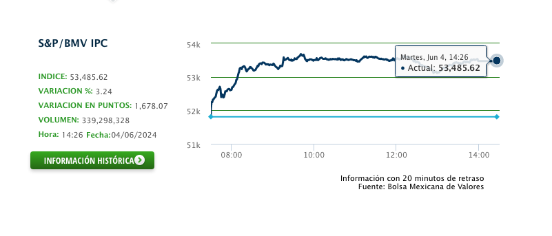 A las 9:30 horas, tiempo del centro de México, el IPC, que se conforma por las 35 empresas más importantes del mercado mexicano listadas en la Bolsa, registraba una ganancia del 3 por ciento y al cierre de la jornada ganó 3.24 por ciento para ubicarse en los 53 mil 485 puntos, luego de que el lunes sufrió su peor caída desde el año 2008.