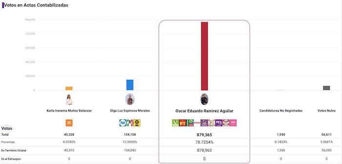 En Chiapas, por ejemplo, Eduardo Ramírez, candidato de Morena-PT-PVEM y un puñado de partidos locales, ganó a Olga Luz Espinosa Morales, del PRIAN, con una diferencia de más de 60 puntos. Ramírez Aguilar tiene, con el 46.13 por ciento de las actas capturadas, una votación del 78-70 por ciento, seguido muy de lejos por Espinosa Morales con el 12.09 por ciento.