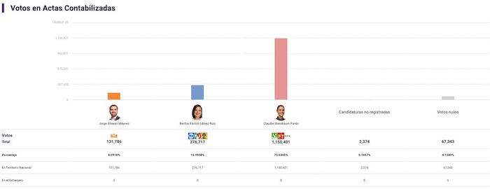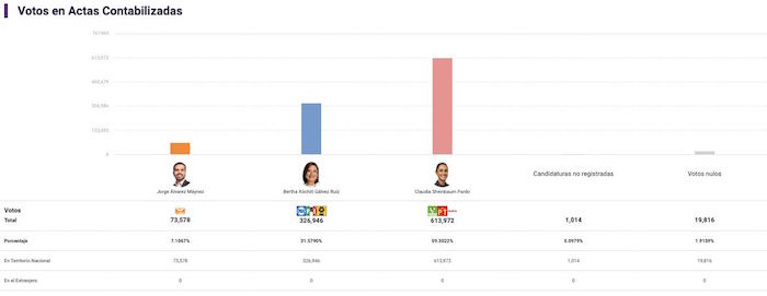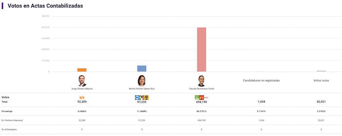 En esta misma entidad, con el 81.22 de las actas capturadas, Claudia Sheinbaum Pardo obtuvo una contundente victoria de más de 53 puntos sobre Xóchitl Gálvez Ruiz, la abanderada del PRIAN. La virtual Presidenta de México registra una votación del 70.5 por ciento, mientras que Xóchitl Gálvez apenas registra un 17 por ciento.