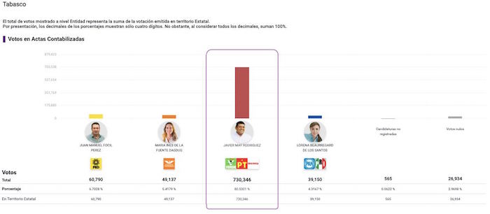 En Tabasco, en tanto, el triunfo fue unánime. En esta entidad, en donde nació el Presidente López Obrador, el exdirector de Fonatur Javier May Rodríguez obtuvo una votación de 80.59 por ciento, con una ventaja de 74 puntos sobre su contendiente más cercano, Juan Manuel Fócil Pérez del PRD. Se trata del triunfo más abultado que obtuvo el oficialismo en este proceso electoral, como se registra en el PREP, con el 84.11 por ciento de las actas capturadas.