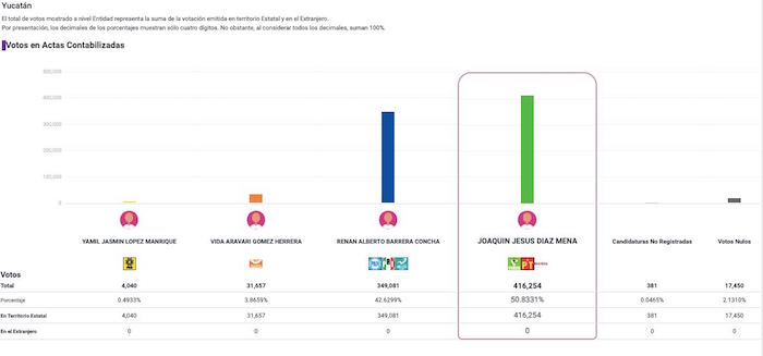 En cuanto a Yucatán, se trata de una de las victorias más cerradas de la izquierda. Los datos preliminares, con el 75.31 por ciento de las actas capturadas, muestra que Jesús Díaz Mena obtuvo una votación de 50.81 por ciento sobre Renán Alberto Barrera del PRI-PAN-PANAL, que obtuvo 42.64 por ciento, es decir un triunfo por ocho puntos.