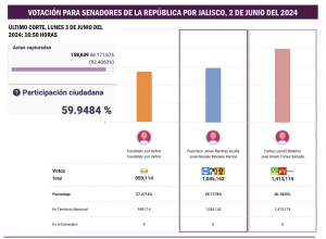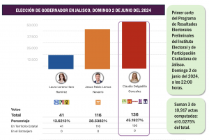 El programa de Resultados Electorales Preliminares en Jalisco ha avanzado a cuentagotas. Pero en ninguna de sus actualizaciones muestra una ventaja amplia y consistente que corrobore las presunciones de los resultados del conteo rápido. A las 24:00 horas del domingo 2 de junio del 2024 el PREP Jalisco tenía apenas contabilizado el 2.92 por ciento de las actas de todo el estado y le atribuía una ventaja de 3.47 por ciento a Pablo Lemus.
