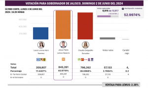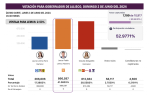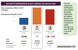 Esta tarde, en la actuación del PREP Jalisco de las 15:20 horas apenas se había sumado el 63.34 por ciento de las actas y la ventaja atribuida a Pablo Lemus representaba un 2.38 por ciento. A las 16:40 horas se volvió a actualizar el PREP Jalisco para la elección de gobernador y la captura de actas llegaba al 65.94 por ciento, con una ventaja de 2.53 por ciento para Lemus Navarro. Una ventaja que no podría ser definitiva cuando todavía faltaban por contabilizarse el 34.06 por ciento de las actas de escrutinio.