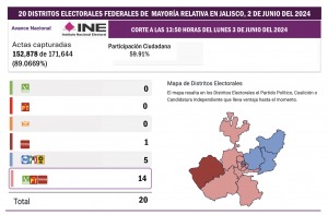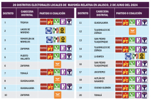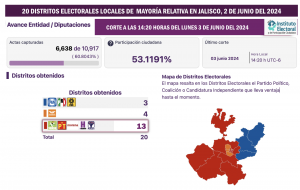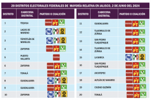 Pero igual sucede en la contienda por las 20 diputaciones federales de Mayoría Relativa: Morena y sus aliados estarían encaminados con claridad para ganar 15 curules en distritos de Jalisco, en tanto que la coalición encabezada por el PAN obtendría 5 y el partido que presumiblemente llevaría a Pablo Lemus a la victoria por la gubernatura no obtendría en esta entidad ningún triunfo de Mayoría Relativa para el congreso federal.
