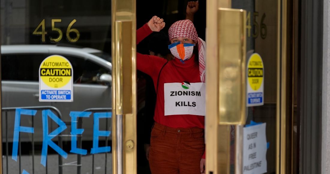 Un grupo de manifestantes ingresó al edificio el lunes y lo ocupó durante varias horas. Los inconformes colocaron pancartas en la puerta principal del lugar en las que exigían el fin de la guerra entre Israel y Hamás.