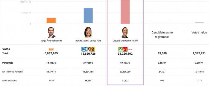 Dentro del país, la abanderada del oficialismo, logró 33 millones 135 mil votos, que representan el 59.2 por ciento del total de 55 millones 923 mil 497 sufragios emitidos en el territorio nacional. En comparación, la opositora Gálvez obtuvo 15 millones 534 mil votos, es decir, el 27.7 por ciento del total, lo que refleja una diferencia de 31.5 puntos porcentuales entre ambas candidatas.