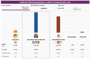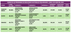 El PREP de la Ciudad de México cerró con el 99.40 por ciento de actas computadas y una diferencia entre el primero y segundo lugar de 22.52 puntos porcentuales. En el caso de Veracruz, el PREP cerró con el 94.77 por ciento de las actas computadas y una diferencia de 26.34 por ciento entre el presunto ganador y el segundo lugar. En Guanajuato, el PREP cerró el lunes con el 100 por ciento de los sufragios contados y una ventaja de 10.4 por ciento para la virtual ganadora.