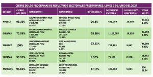 Mientras que en Puebla el PREP cerró con el 99.10 por ciento de las actas computadas y una ventaja de 26.3 por ciento para el presunto ganador. En Chiapas operó el PREP que cerró con menos porcentaje de casillas computadas en la elección de Gobernador, pero la diferencia, entre el primero y el segundo lugar ya era del 65.98 por ciento. Mientras que en Tabasco el PREP cerró con 100 por ciento de sufragios computados y una ventaja para el presunto ganador de 73.61 por ciento. En Yucatán el PREP cerró con el 99.56 por ciento de votos sumados y una distancia de 8.35 por ciento entre el primero y el segundo lugar. En tanto que en Morelos el PREP cerró con el 95.85 por ciento de las actas computadas y una ventaja de 17.17 por ciento para la candidata ganadora.