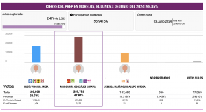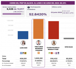 Al cierre del PREP Jalisco, a las 22:40 horas del lunes 3 de junio del 2024, el candidato a Gobernador de Movimiento Ciudadano, Jesús Pablo Lemus Navarro, tenía una ventaja de apenas el 3.8 por ciento sobre la abanderada de Morena-PT-Partido Verde, Claudia Delgadillo González, que representarían 91 mil 287 votos, cuando todavía faltaban por contabilizarse por lo menos otros 328 mil 154 sufragios.