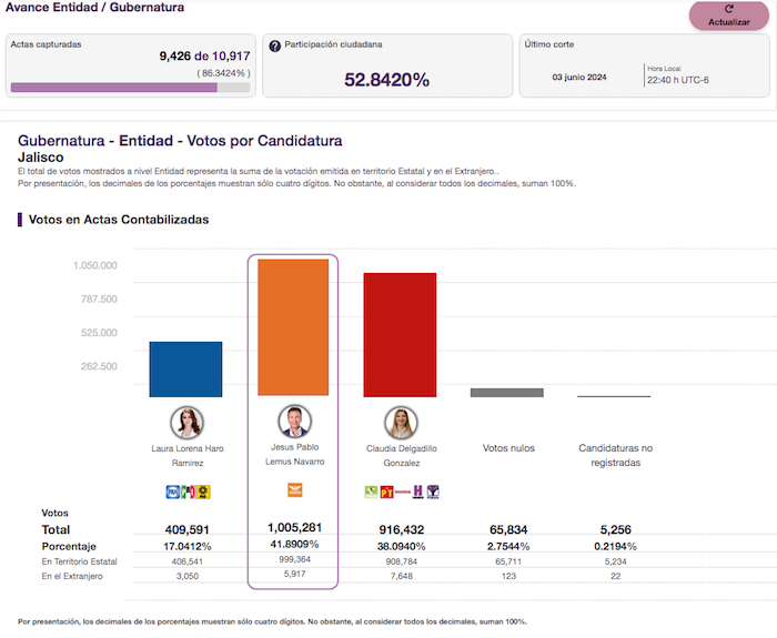 El Instituto Electoral de Jalisco dio el triunfo a Pablo Lemus pese a un cúmulo de irregularidades como el hecho de que Movimiento Ciudadano perdió 15 distritos federales de 20; 13 distritos locales de 20, y no obtuvo ninguna senaduría. “No es posible que haya sido este resultado así cuando no se tiene computado el 30 por ciento restante de las actas”, cuestionó en entrevista Sergio Gutiérrez Luna, representante de Morena ante el INE.