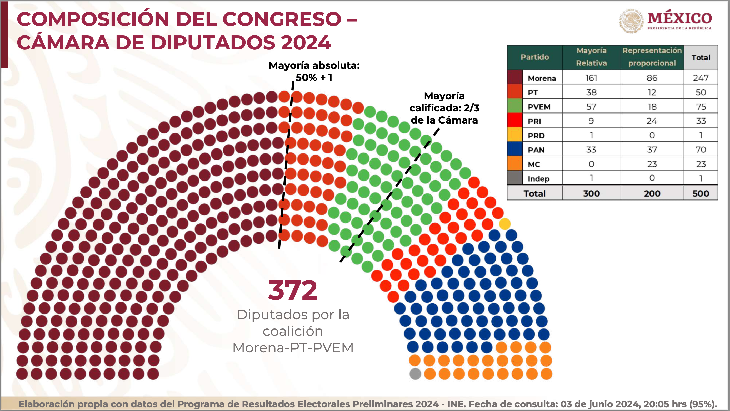 Incluso, el Partido Verde Ecologista de México (PVEM) aumentará su influencia política en la Cámara de Diputados al quedarse como segunda fuerza política. Morena lograría la mayoría con 247 diputados; el PVEM, 75; PAN, 70; PT, 50; PRI, 33; MC, 23; PRD, 1; y un diputado independiente, según las proyecciones.