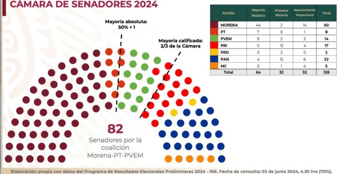 De acuerdo con las proyecciones de la Segob, Movimiento Ciudadano tendrá entre cuatro y cinco senadores en la nueva legislatura: uno de primera minoría y cuatro de representación proporcional. Esto representa una disminución de siete curules, ya que en la legislatura actual cuentan con 12 senadores. Así, el partido naranja queda como séptima fuerza política en el Senado, solo por arriba del PRD, que enfrenta una inminente pérdida de registro al no lograr el umbral del 3 por ciento requerido de votos en ninguna de las contiendas federales. Morena quedaría con aproximadamente un total de 60 senadores, PAN con 22, PRI con 17, PVEM con 14, PT con 8, MC con 5 y PRD con 2.