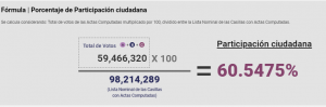 Tras los resultados, la participación ciudadana alcanzó el 60.52 por ciento a nivel nacional; sin embargo, dos millones 183 mil 428 votos fueron nulos con el 3.68 por ciento del total, además de 49 mil 218 votos por candidaturas no registradas con un 0.08 por ciento.