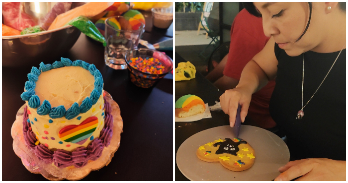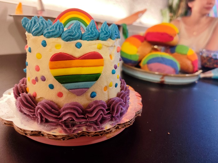Cardín Pastelería cuenta con una actividad imperdible: un divertido taller para decorar un mini pastel y una galleta con motivos del Pride. La dinámica es sencilla pero divertida, ellos ya tienen listo el pan para formar el pastel y desde ahí parte todo; en nuestro caso Jessica nos explicó cómo construir el pastel, es decir, colocas la base, después relleno (puede ser nutella o de queso), pan y así sucesivamente; entonces viene lo bueno que es cubrir de betún y decorar. Jessica nos compartió algunas técnicas y de ahí en adelante todo es cuestión de dejar volar la creatividad, en esta ocasión como se realiza con motivo del Pride hay arcoíris para integrar al pastelito.
