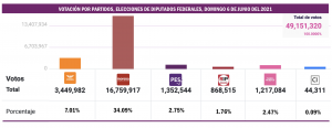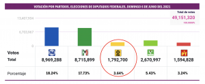 En los comicios intermedios del 2021, cuando se votó en todo el país para la renovación de la Cámara de Diputados -300 legisladores de Mayoría Relativa y 200 de Representación Proporcional-, el partido del sol azteca obtuvo el 3.64 por ciento de la votación nacional para conservar su registro, superando con menos de un punto el piso mínimo exigido por la ley, del 3 por ciento. Pero esa tranquilidad únicamente duraría tres años.